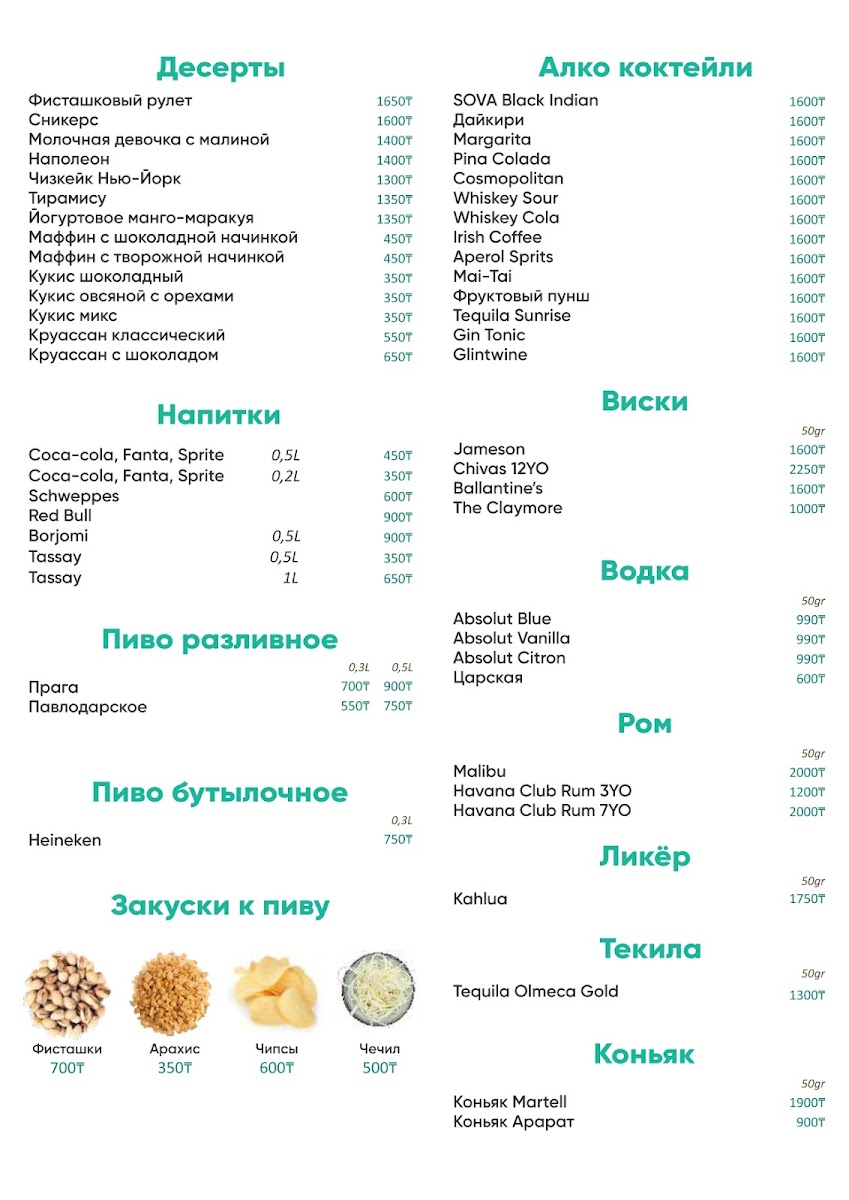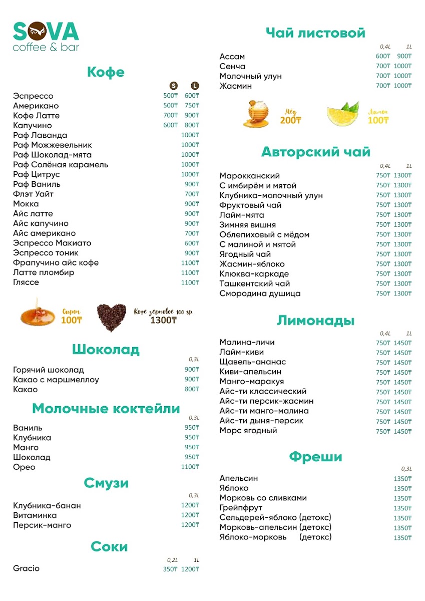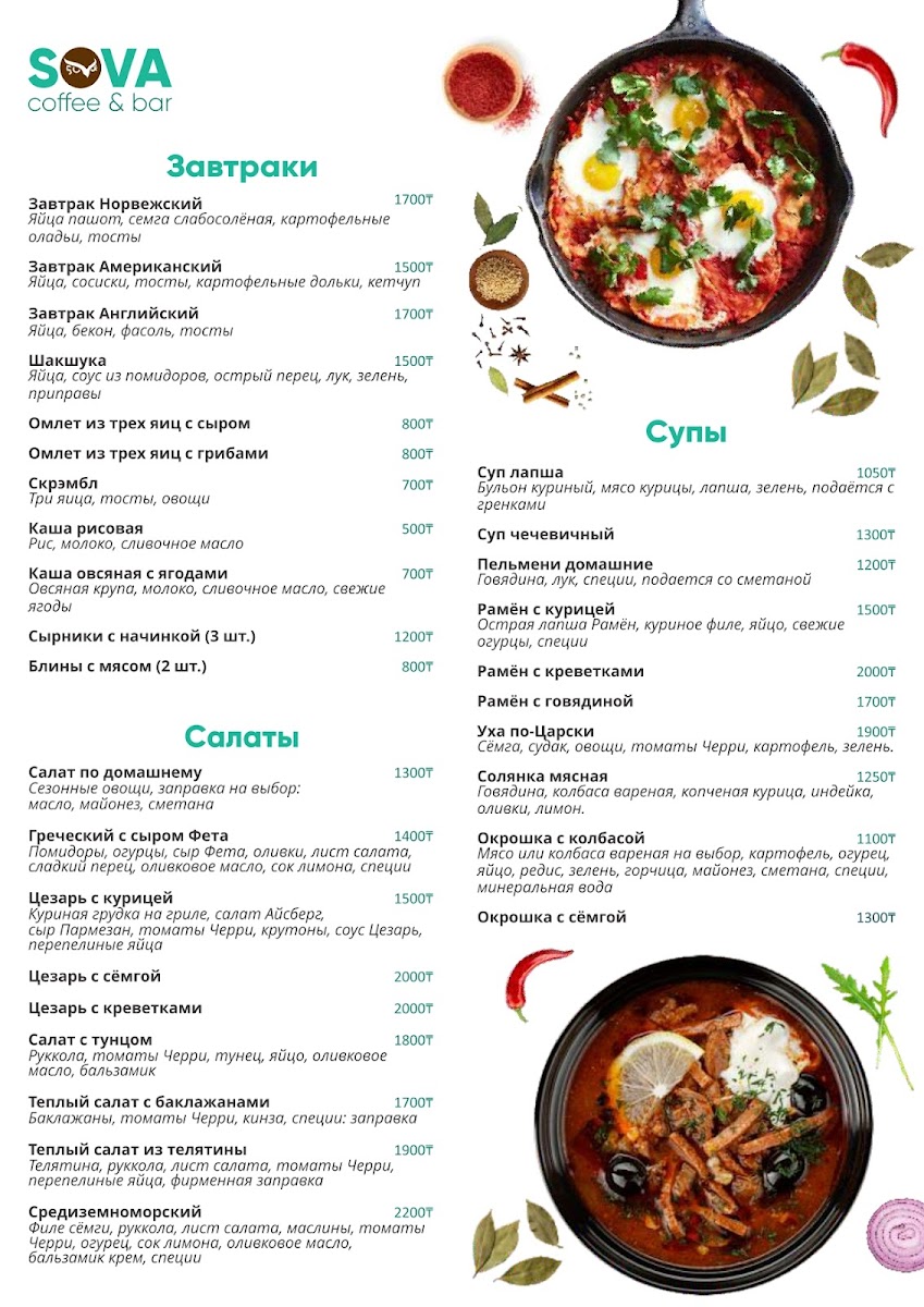 At Sova Coffee & Bar on Abay Avenue, the menu strikes a careful balance between classic comfort and modern café creativity. Breakfast offerings are a highlight, with the hearty Английский Завтрак providing a satisfying start to the day, while the rich, flavorful Шакшука showcases perfectly cooked eggs in a subtly spiced tomato sauce. For those with a sweet tooth, the Сырники and Блинчики are delicate and fresh, offering a light indulgence that pairs beautifully with a cup of Чай С Клубникой. Coffee enthusiasts will appreciate the expertly brewed Капучино and the robust Кофе Американо, each served with attention to temperature and texture, elevating even a simple coffee break. Overall, the menu reflects a thoughtful curation where each dish, from breakfast classics to sweet treats and coffee specialties, feels carefully prepared to deliver both comfort and quality in every bite. The combination of diverse flavors and well-executed presentation makes Sova Coffee & Bar a standout choice for both casual mornings and relaxed afternoons.